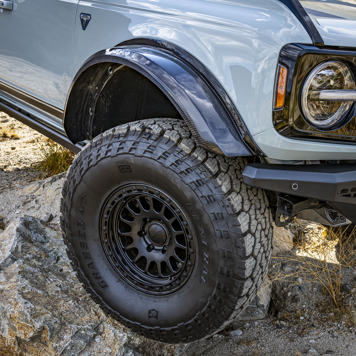 Gain clearance for larger tires while improving the looks of your Bronco with these durable, high quality hand-laid carbon fiber flares from Composite Offroad Parts. These flares are hand laid with 100% grade A 3K and 12K 2X2 weave carbon fiber. Durable marine resin with a clear automotive finish provides long-lasting UV protection and great looks. Available in 4″ and 6″ widths.