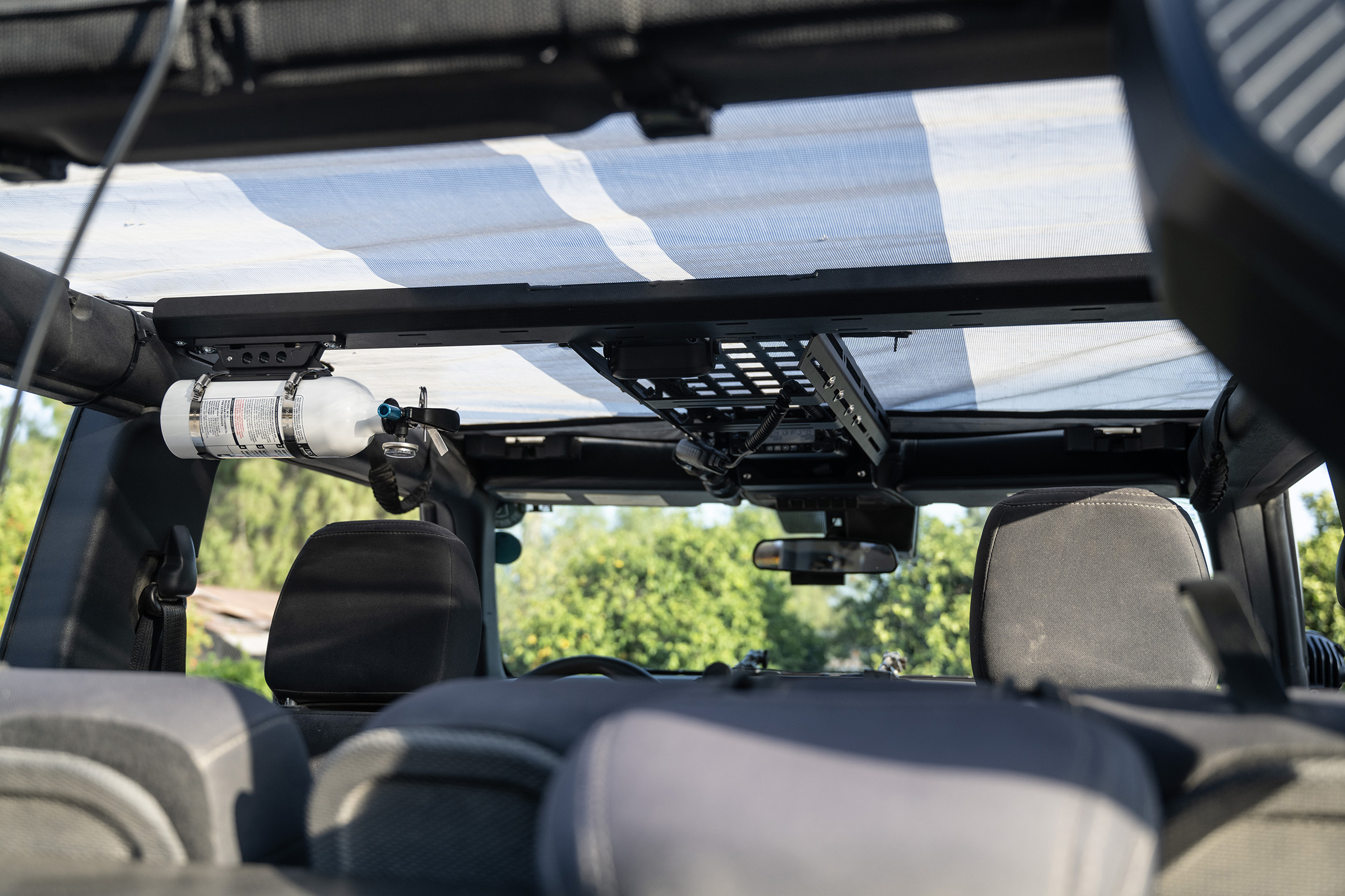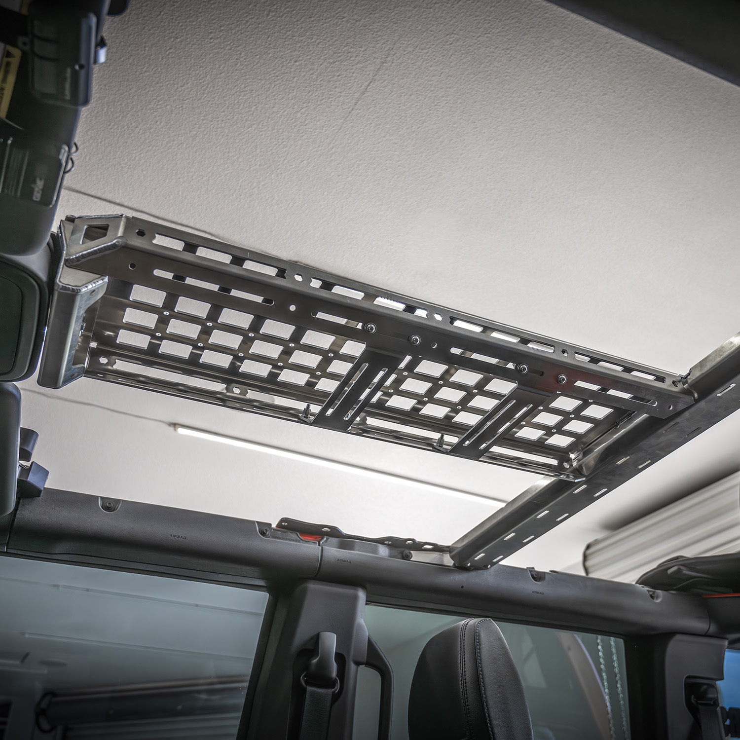 Lobo Off-Road’s Overhead Mount System is the ultimate solution for securely mounting electronics, interior lighting and other gear inside your Bronco’s cockpit, out of the way, overhead. The system is fully adjustable with countless possibilities for mounting accessories.